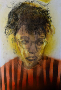 Un’audace composizione che fonde la delicatezza del ritratto con l’intensità del cubismo. Attraverso una sapiente tecnica mista, ho costruito il