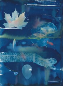 La materia organica trovata in natura e collezionata in studio diventa segno pittorico attraverso il processo fotografico della cianotipia. Insieme