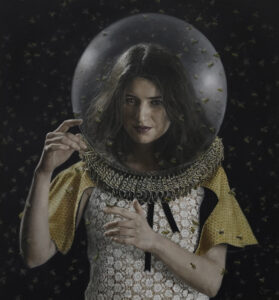 Oil on Canvas The figure is portrayed here as a futuristic guardian of bees, embodying her deep care for the