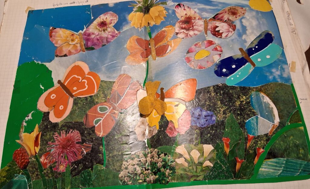 Collage di carta, con farfalle tratte da una rivista di fiori.
