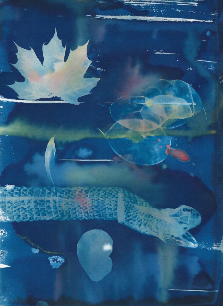 La materia organica trovata in natura e collezionata in studio diventa segno pittorico attraverso il processo fotografico della cianotipia. Insieme all’acquerello nascono effetti cromatici astratti…